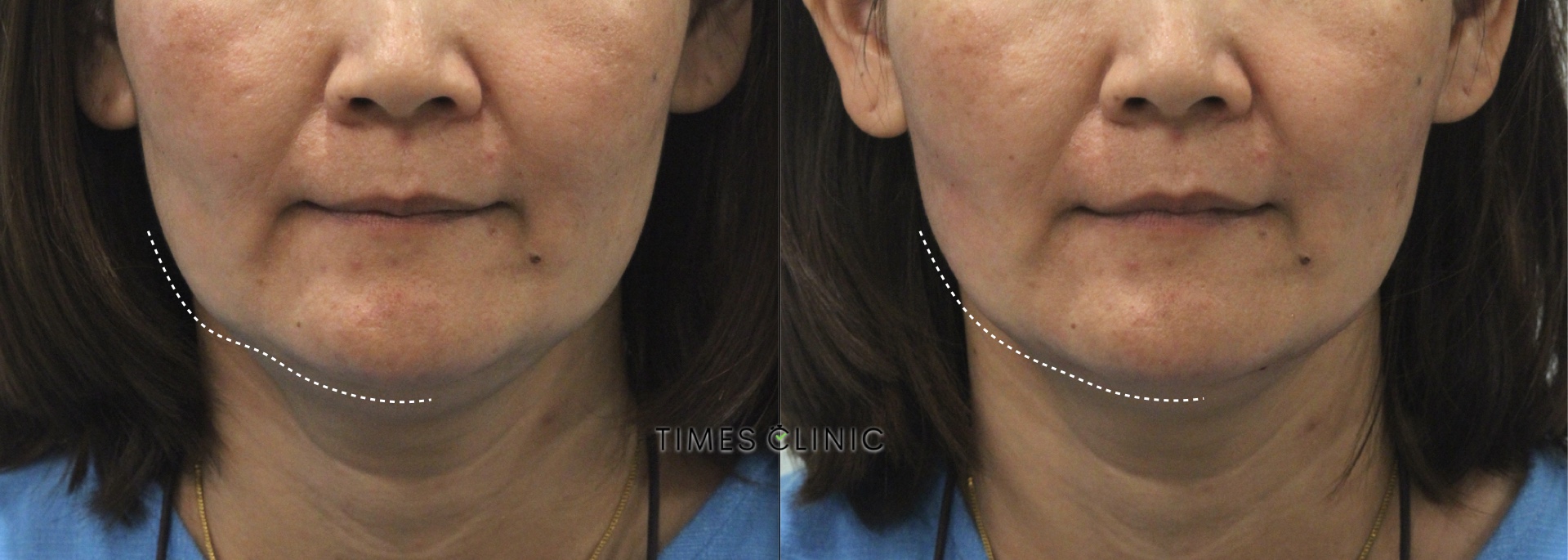 จากภาพ เบื้องต้นดูเหมือนส่วนแก้มย้อยลงมา แต่หลังจากแพทย์ตรวจประเมินพบว่ากระดูกกรามยุบตัวลง จึงแก้ไขด้วยการเสริมแนวกรามด้วย HA Filler (ภาพถ่ายหลังทำทันที)